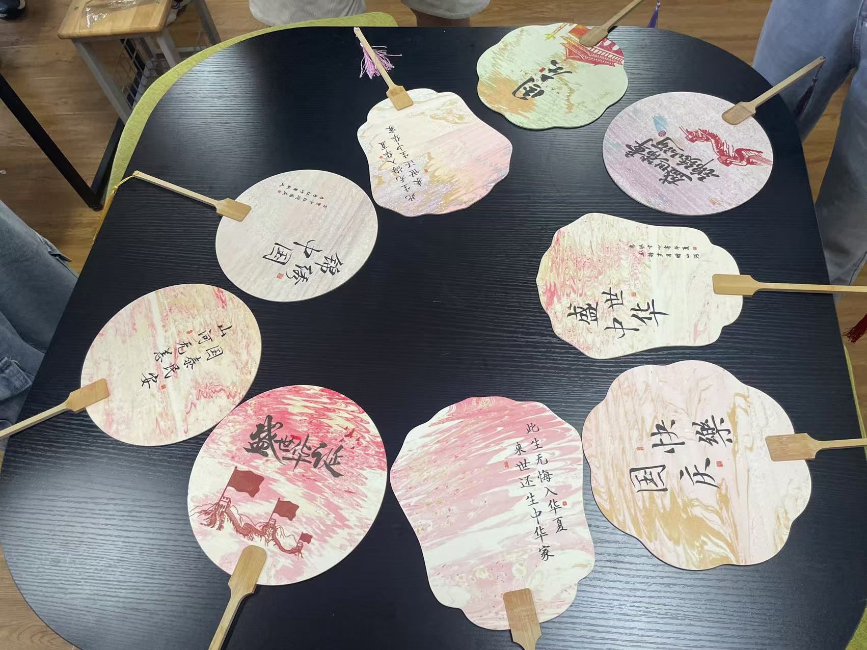 本次活动以传统工艺为载体,深度融合爱国主义文化,学院师生以漆为笔,以水作画,将非遗大漆与爱国主义情怀融于扇面,深情告白祖国,以实际行动庆祝新中国成立75周年。