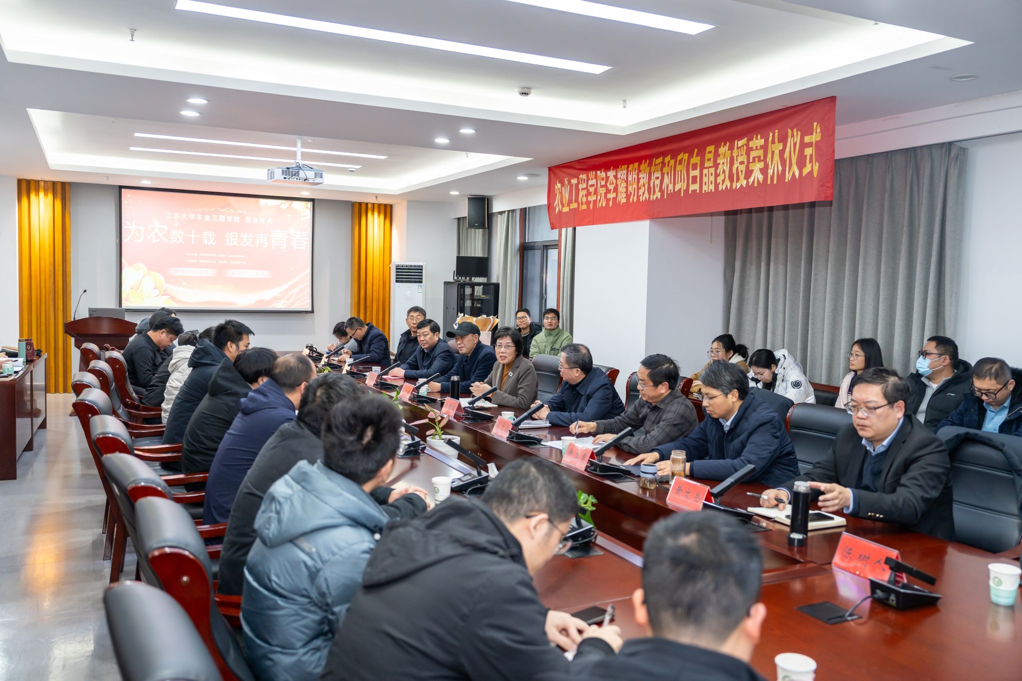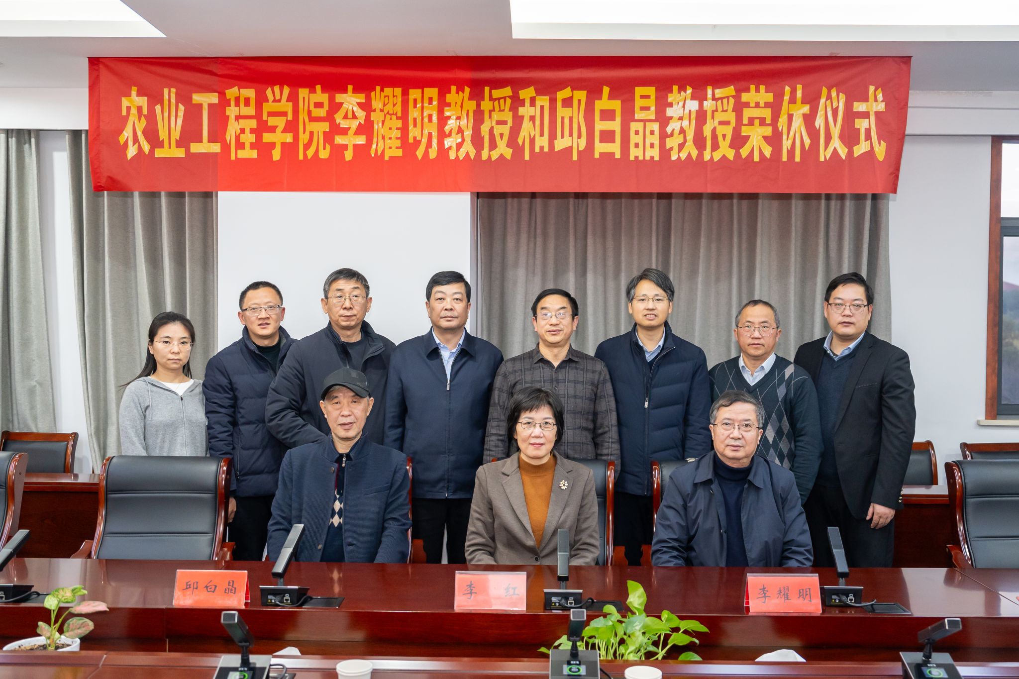 12月16日,国产自拍 在耒耜大楼F304会议室举行关工委老教师李耀明和邱白晶的荣休仪式。校党委常委、副校长李红,院党委书记、关工委主任廖志凌,院长贾卫东,重点实验室主任徐立章,副院长王新忠,副院长黄文岳,副书记、副院长、关工委副主任周军,关工委副主任陈树人,关工委青年委员、工会主席徐香茹等师生代表60余人参加仪式。仪式由廖志凌主持。