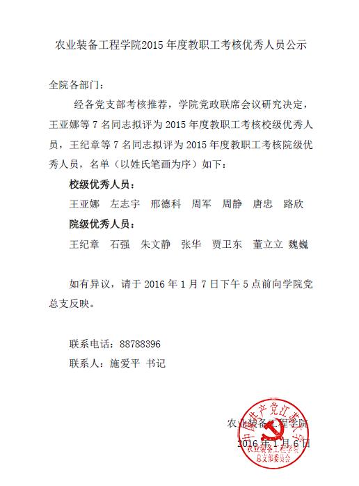 农业装备工程学院2015年度教职工考核优秀人员公示