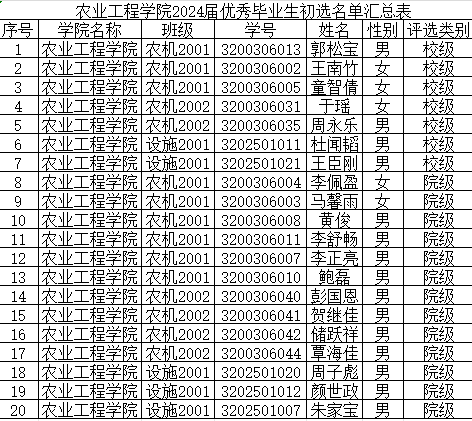 本科生先进班集体、先进个人评选办法》(江大校〔2021〕93号)的第十三条、十四条规定,经学院评审领导小组评审,现将2024届本科优秀毕业生初选结果公示如下: