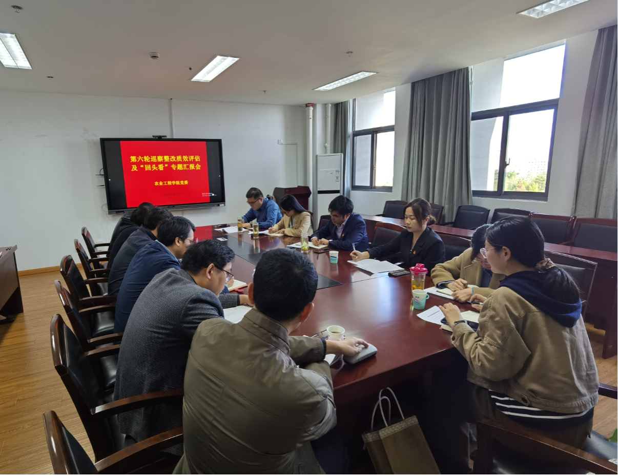 On October 25th, the sixth round of inspection and rectification quality and efficiency evaluation and "look back" work special report meeting was held in the conference room 1026 of the College of Agricultural Engineering. Xu Huihong, Director of the Supervision and Supervision Division of the School Disciplinary Committee, member of the School Disciplinary Inspection Committee, Wang Yiyi, Disciplinary Inspector, all members of the second inspection team of the sixth round of inspections of the school attended the meeting, and members of the leadership team of the Party Committee of the School of Agricultural Engineering attended the meeting. The meeting was presided over by Jin Yucheng, Secretary of the Party Committee of the School of Agricultural Engineering.